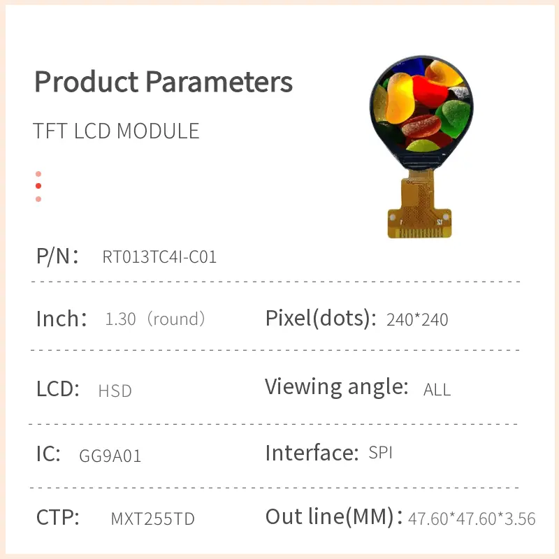 The RT013TC4I-C01 is a 1.3-inch IPS TFT LCD Module designed for applications that demand superior viewing angles, high brightness, and reliable performance. With its 240×240 RGB resolution, SPI interface, and integrated white LED backlight, this module is ideal for industrial displays, handheld devices, and interactive terminals. Its IPS technology ensures consistent color and clarity across wide viewing angles, making it a versatile choice for demanding environments.