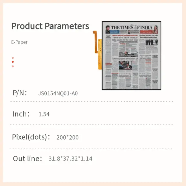 The JS0154NQ01-MNG-A0 is a 1.54-inch active matrix electrophoretic display (AMEPD) module designed for ultra-low-power, compact applications. With a square 200×200 pixel format, high contrast, and robust reliability, it is an ideal choice for electronic shelf labels, wearable devices, and portable information displays where power efficiency and readability are critical.